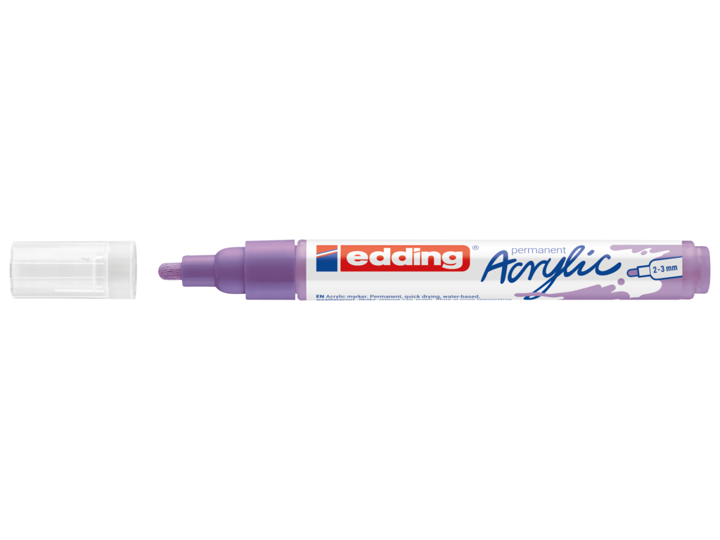 Akrylový popisovač edding 5100 M je skvělým pomocníkem při kreslení obrázků na plátno, nebo například pro malování na kameny. Skvěle vypadá na světlých i tmavých površích materiálů jako je plátno, malířský papír, hladké dřevo a kámen. Vysoce kvalitní pigmentovaná akrylová barva na bázi vody je po zaschnutí permanentní, světlostálá a bez zápachu. Vhodné pro kreativní vyjádření umělců i laiků.