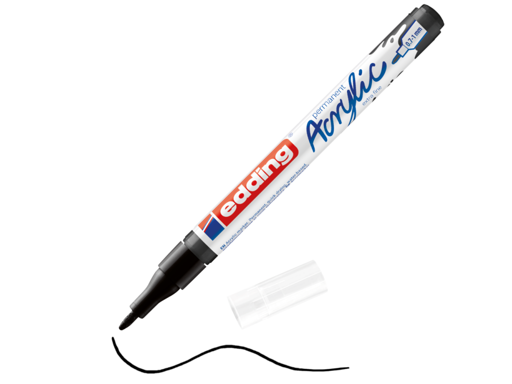 Barva ve formě pumpovacího fixu se snadno nanáší. Popisovač je vždy připraven k použití, nejsou potřeba žádné štětce a další potřeby. Stačí otevřít, zapumpovat a rovnou malovat. Ventilový systém umožňuje rovnoměrný tok inkoustu. Barva černá je vysoce kryvá. Odolný kulatý hrot se šířkou stopy 0,7–1 mm je ideální na kreslení kontur a dalších detailů s lehkostí. Lze kombinovat s ostatními akrylovými popisovači a spreji edding 5200.